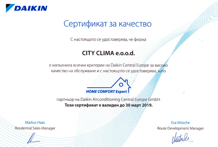 Фирмата е отличена от Daikin със сертификат HOME COMFORT EXPERT